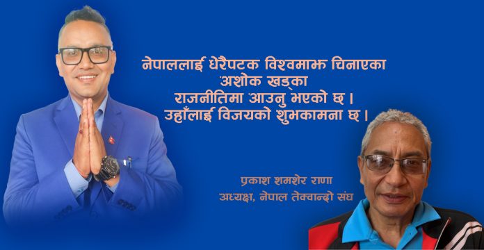 (आउँदो मंसिर ४ गतेको चुनावका लागि उम्मेदवारको प्रचारप्रसार र मतदाताको दृष्टिकोण बाहिर आउन थालेको छ । काठमाडौँ क्षेत्र नं। २ मा पनि चुनावको चहलपहल बढेकै छ । हामी यसपटकको प्रदेश र प्रतिनिधिसभाका उम्मेदवारहरुसँगै मतदाताको चाहना कस्तो छ भनेर उनीहरुका विचार क्रमशः सार्वजनिक गरिरहेका छौँ । यस क्रममा नेपाल तेक्वान्दो संघका अध्यक्ष प्रकाश शमशेर राणाको राखेका छौँ । कागेश्वरीखबर डटकममा अरू उम्मेदवार र मतदाताको पनि विचार क्रमशः प्रकाशित हुनेछ – सम्पादक)