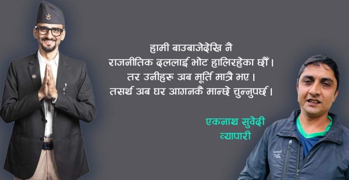 (आउँदो मंसिर ४ गतेको चुनावका लागि उम्मेदवारको प्रचारप्रसार र मतदाताको दृष्टिकोण बाहिर आउन थालेको छ । काठमाडौँ क्षेत्र नं। २ मा पनि चुनावको चहलपहल बढेकै छ । हामी यसपटकको प्रदेश र प्रतिनिधिसभाका उम्मेद्वारहरुसँगै मतदाताको चाहना कस्तो छ भनेर उनीहरूका विचार क्रमशः सार्वजनिक गरिरहेका छौँ । यस क्रममा स्थानीय व्यवसायी एकनाथ सुवेदीको विचार प्रस्तुत गरेका छौँ । कागेश्वरी खबर डटकममा अरू उम्मेदवार र मतदाताको पनि विचार क्रमशः प्रकाशित हुनेछ – सम्पादक)