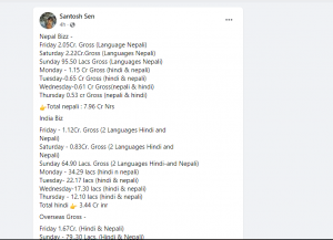 निर्माता सन्तोष सेनले सामाजिक सञ्जालमार्फत फिल्मको नेपाल, भारत र विश्वव्यापी कमाइलाई बाहिर ल्याएका छन् । उनका अनुसार फिल्मले प्रदर्शनको पहिलो साता नेपालमा ७ करोड ९६ लाख रुपैयाँ ग्रस कलेक्सन गरेको छ ।