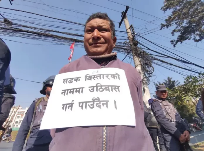 ‘डोजर आतंक बन्द गर, महानगरको ज्यादती बन्द गर, सडक विस्तारका नाममा उठिबास गर्न पाइँदैन, संविधानले सुनिश्चित गरेको सम्पत्तिको अधिकार सुनिश्चित गर,’ जस्ता नारा लेखेको प्लेकार्ड बोकेर काठमाडौंवासी प्रदर्शनमा उत्रिएका हुन् ।