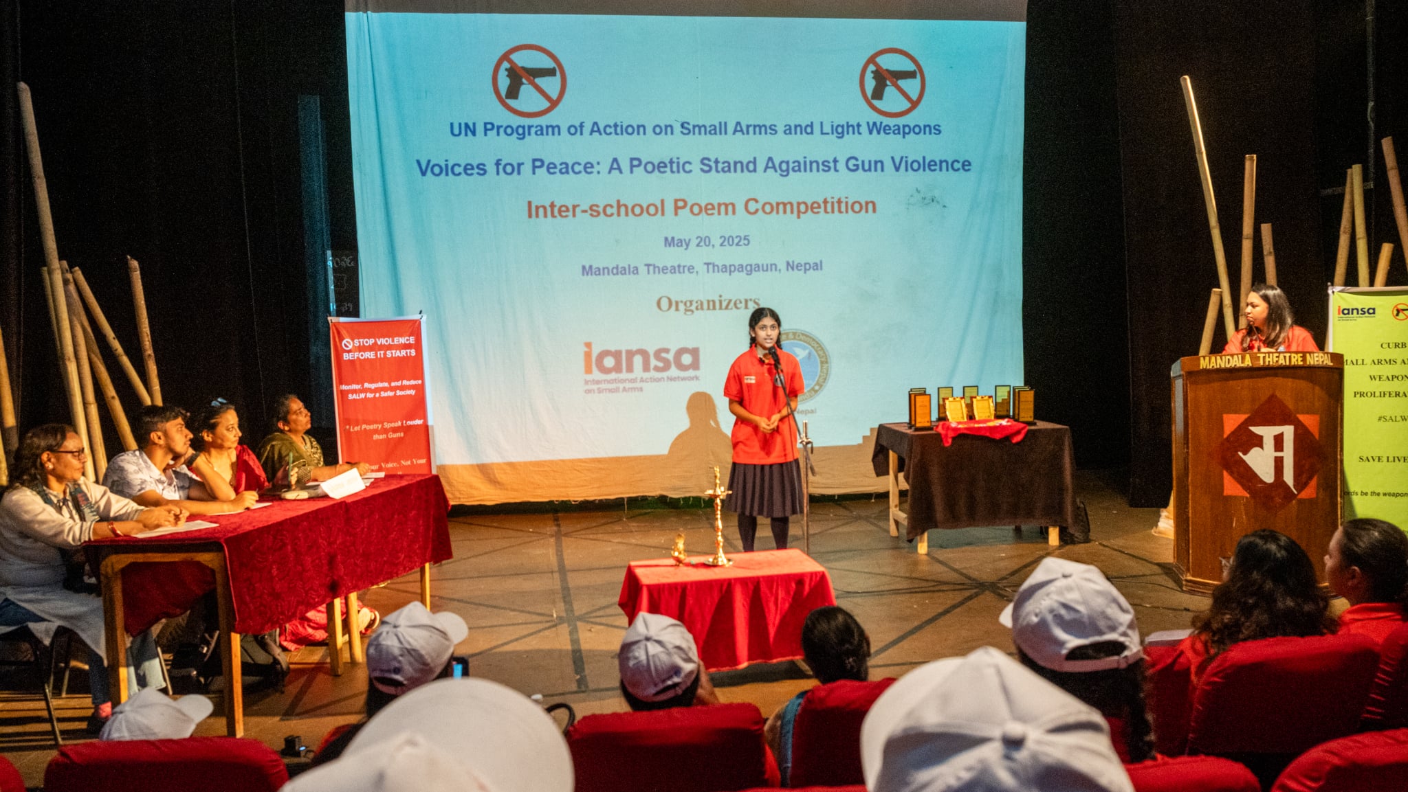 काठमाडौँ। “शान्ति र लोकतन्त्रको लागि महिला नेपाल” संस्था र “साना हतियार सम्बन्धी अन्तर्राष्ट्रिय सञ्जाल” (IANSA) को संयुक्त आयोजनामा सन् २०२५ मे २० तारिखका दिन मण्डला थियटर, काठमाडौँमा “शान्तिको आवाज: बन्दुक हिंसाविरुद्ध कवितामार्फत् प्रतिवाद” शीर्षक अन्तरविद्यालय कविता वाचन प्रतियोगिता भव्य रूपमा सम्पन्न भएको छ।